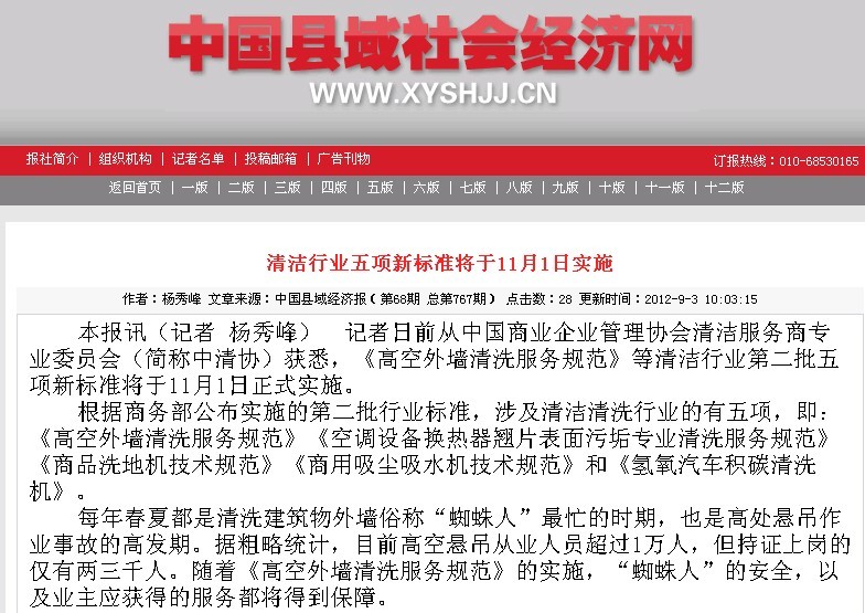 根據商務部2012年47號文件,公布生效實施第二批行業標準,愛瑞特主持起草的“商用洗地機技術規范”(SB/T10739-2012)于2012年11月1日生效,并在全國范圍內正式實施,此標準由中華人民共和國商務部歸口,中國標準出版社出版發行。標準實施后,將有序規范洗地機行業市場,對行業健康發展做出有力推動。