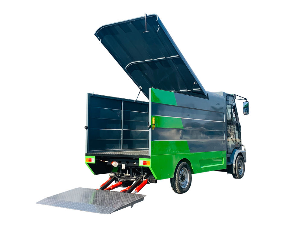 ◆ 液壓系統:72V直流電機雙缸四桿液壓裝置,可通過線控或無線遙控操作,控制尾板作業